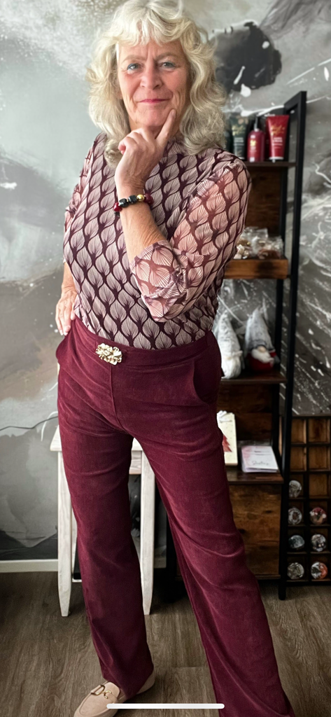 Fluwelen broek met elastische boord en gouden broche detail. De broek zit hoog in de taille en valt ruim.