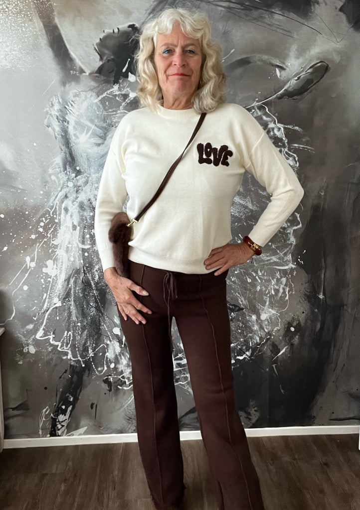 Fijn gebreide comfi broek in het bruin. De broek heeft een naad over de voorkant van de broek en franjes aan de uitlopende pijp.