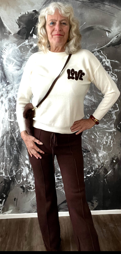Heerlijke comfi trui met lange mouw in het wit met opdruk met de letters love in het bruin.
