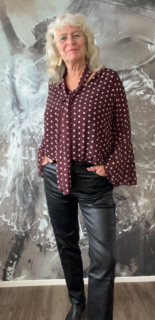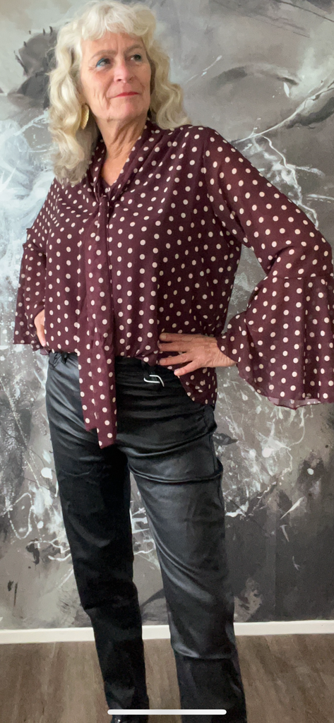 Ruim vallende blouse met stippen , v hals en klokkende mouw.