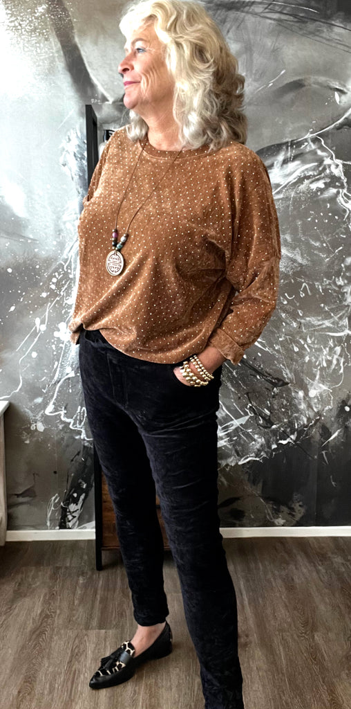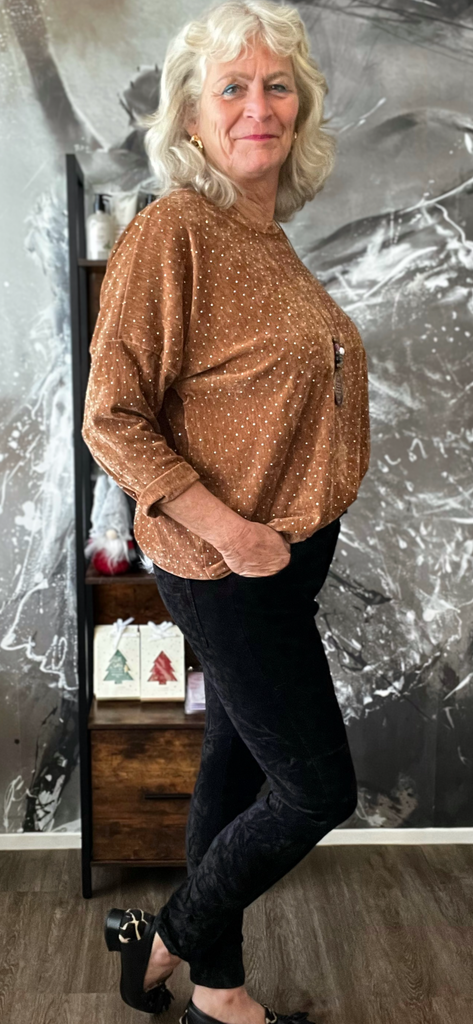 Heerlijke velourse top in 3 kleuren , coffee, zwart en bruin. De top is voor en achter afgezet met strass steentjes. One size draagbaar tot maat 44/46